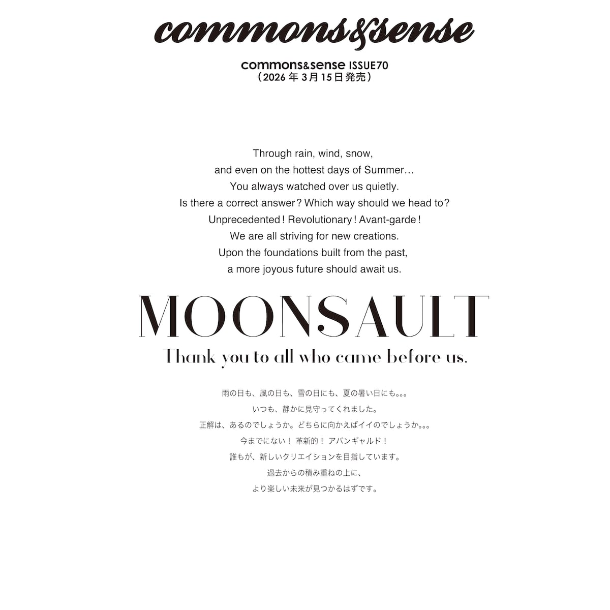 最新号 commons&sense ISSUE70(2026年3月15日)発売のテーマは、“MOONSAULT”です。